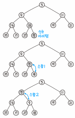 그 후 부모 노드와 서로 비교한 후에 적절한 위치가 아니라면 서로의 위치를 바꿉니다.
