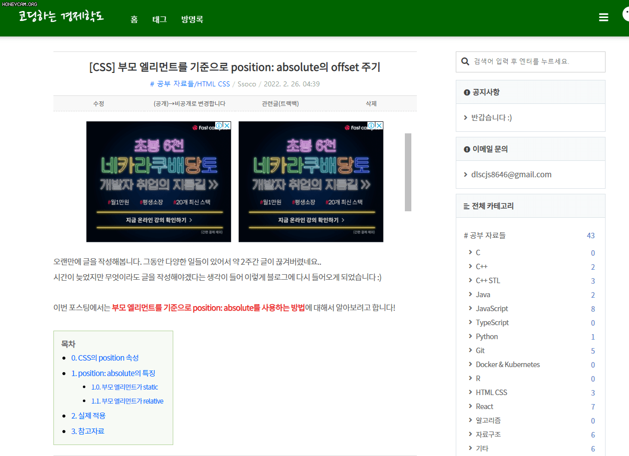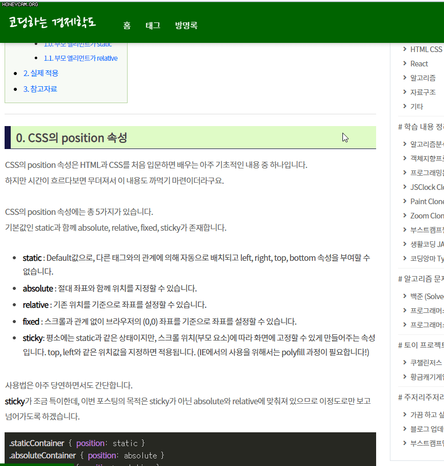 어제 새벽에 CSS의 position 속성을 공부하면서 새롭게 알게 된 sticky를 블로그에 적용시켜봤습니다.