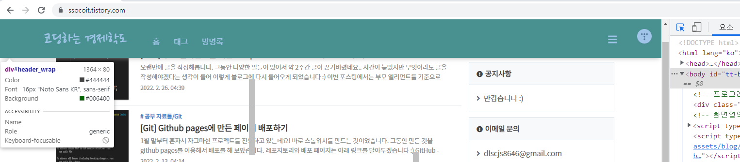 저는 헤더부분을 찾아야 하기 때문에 헤더에 마우스를 올려서 header_wrap라는 id값을 확인했습니다.