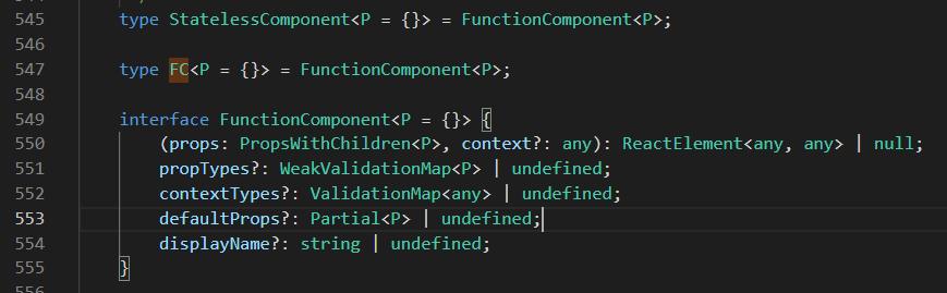 React에서 props를 전달할 때 많이 쓰는 React.FC 역시 index.d.ts파일 내부에 인터페이스가 잘 정의되어 있는 모습을 확인할 수 있습니다.