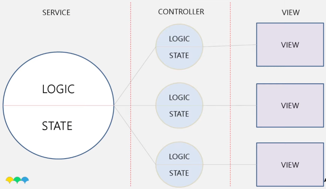 Angular는 Service와 Controller로 나누어서 각각의 위치에 맞는 상태를 모아서 가지고 있게 됩니다.