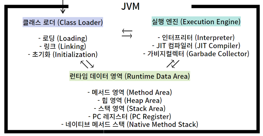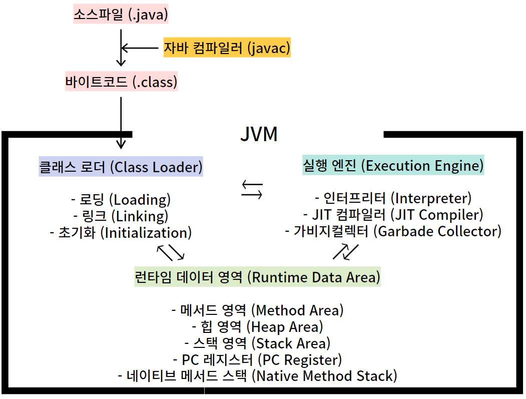 이렇게 복잡하게 타겟 플랫폼에 맞춰서 컴파일해야한다는 단점을 보완하기 위해서, Java의 바이트코드는 JVM(Java Virtual Machine)이라는 자바를 실행하기 위한 가상 기계 위에서 돌아감으로써 문제를 어느정도 해결할 수 있었습니다.