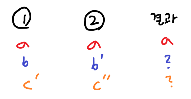 그리고 b의 경우 원본에서 변경된 내용이 2번 브랜치한테만 있으니 2번 브랜치의 b'가 결과값이 됩니다.