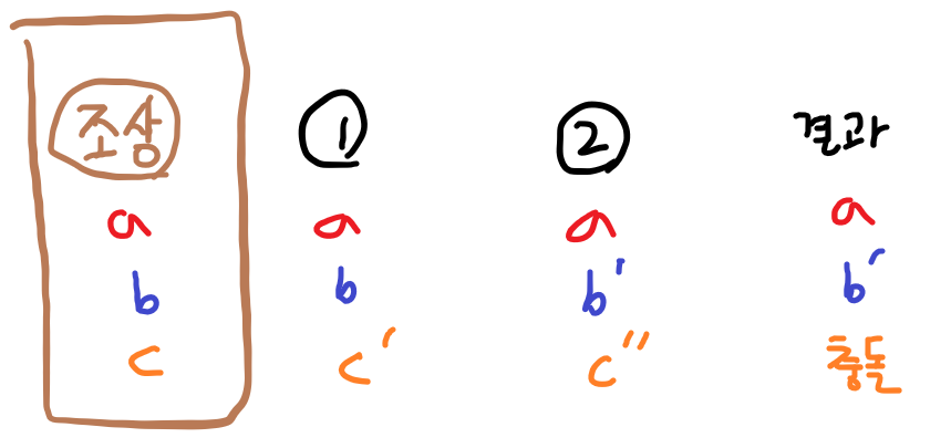 하지만 c의 경우 두 브랜치에서 모두 변경되었기 때문에 결과를 c'로 해야할 지, c''로 해야할 지 알 수 없기 때문에 충돌이 난다는 것을 확실하게 알 수 있는 것이죠.
