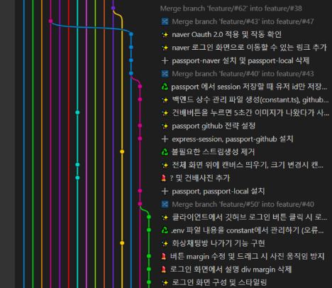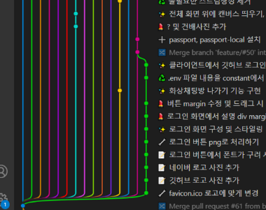 해당 시점에 개발을 할 때는 기본 Merge 전략만 사용했기 때문에 저런 그래프가 등장하게 되었습니다.