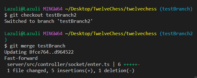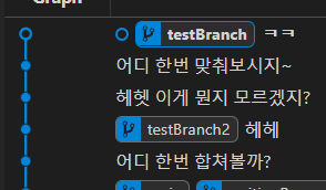 이제 testBranch2로 넘어가서 testBranch와 merge를 하게 되면?