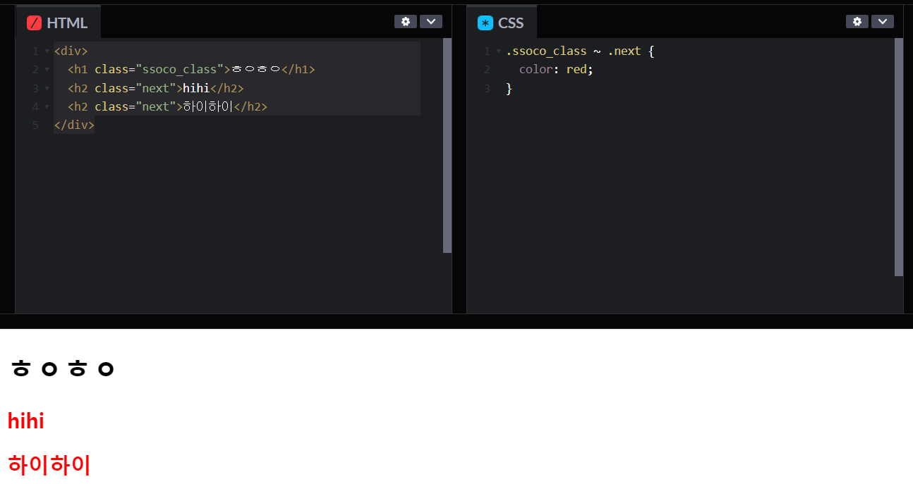 일반 형제 결합자("~")는 서로 형제인 요소 중에서 앞 요소 뒤에 뒤 요소가 존재하는 경우 전부 선택하는 결합자입니다.
