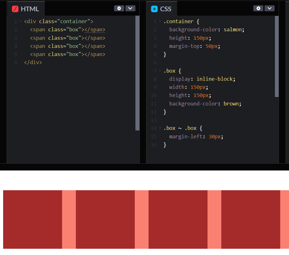 아래와 같이 .box + .box 형태를 사용하면 box 클래스 뒤에 box 클래스가 있는 경우에 CSS 규칙이 적용되기에 보다 명확하고 깔끔하게 CSS를 적용할 수 있습니다.