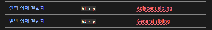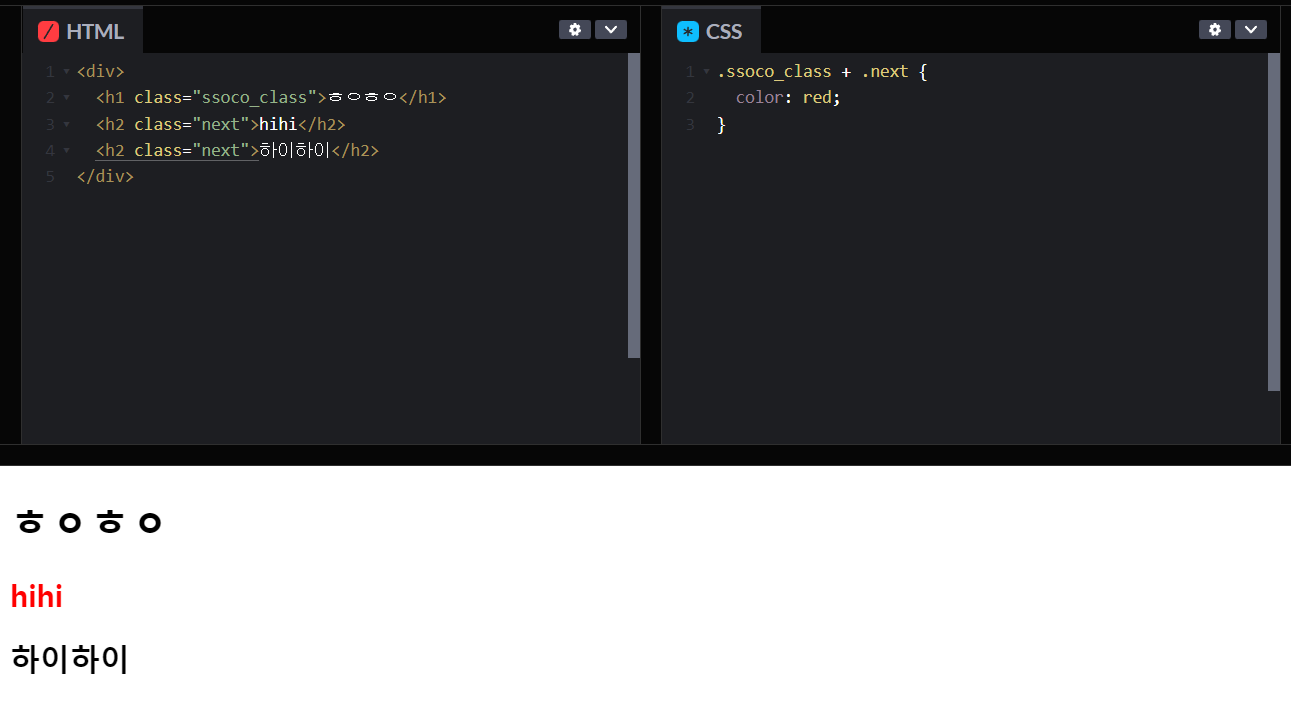 인접 형제 결합자("+")는 앞에서 지정한 요소의 바로 다음에 위치하는 형제 요소만 선택하는 결합자입니다.