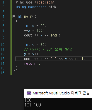 ++x가 lvalue에 있어서 돌아가지 않을 것 같지만, 실제로는 잘 돌아갑니다.