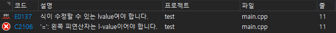 30 = 30, 상수에 상수를 대입한다, 당연히 오류가 나겠죠? 왼쪽 피연산자가 수정할 수 없는 상수이기 때문에 컴파일 과정에서 2106이라는 오류가 발생합니다. lvalue는 수정할 수 없는 값이니까요.