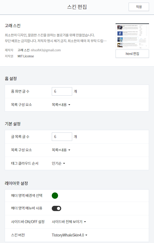 고래 스킨의 조금 아쉬운 점은 아무래도 유료 스킨에 비해서 간단하게 바꿀 수 있는 옵션의 수가 적다는 것이 있습니다. 이 말은 사용하는 사람이 HTML과 CSS를 어느 정도 다룰 수 있어야 커스터마이징하기 좋다는 이야기가 되겠죠.
