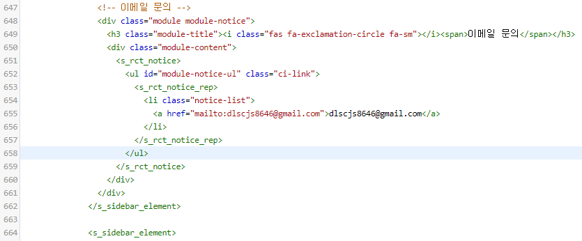 그럼 공지사항이 2개가 될 텐데요, 들어갈 내용은 다르기 때문에 공지사항이라고 되어있는 부분을 이메일 문의라고 수정해줍니다. 그리고 637줄에 보이는 a href(하이퍼텍스트 레퍼런스)라는 링크를 달아주는 녀석이 있습니다. 이 a태그를 싹 다 지워줍니다.