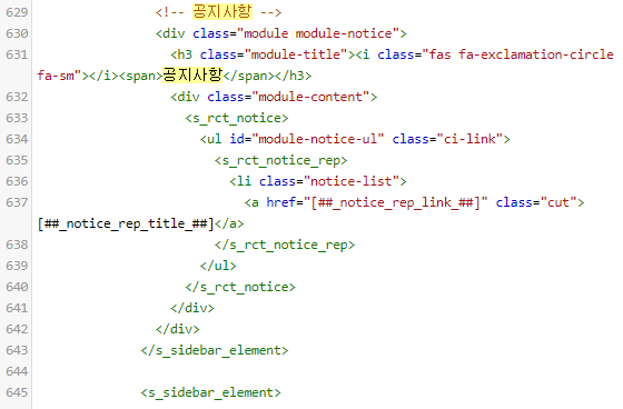 우선 ctrl + f 신공을 통해 공지사항 박스가 있는 위치를 찾습니다. 고래님께서 친절하게 주석을 달아주셨기 때문에 쉽게 찾을 수 있습니다. (2군데가 나올텐데, 아랫쪽에 있는 녀석이 우리가 사용할 사이드바에 위치한 공지사항 박스입니다.)