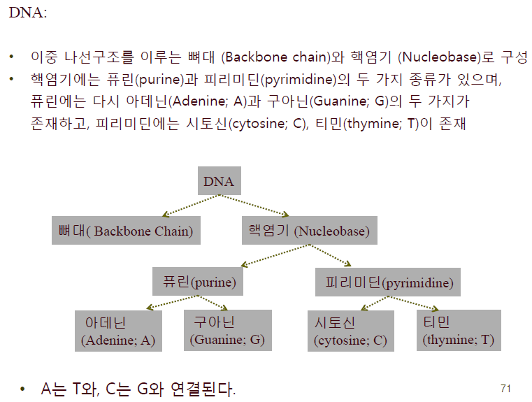 DNA는 이중 나선구조를 이루는데, 핵염기의 조합은 각각 2*2로 4개의 알파벳이 서로 조합된 형태입니다.