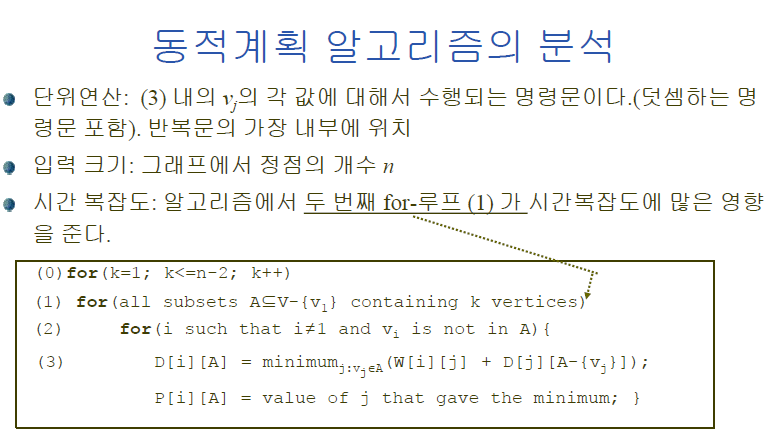 본 알고리즘의 시간복잡도는, 두 번째 for 루프에서 큰 영향을 받아 지수형태로 나타나게 됩니다.