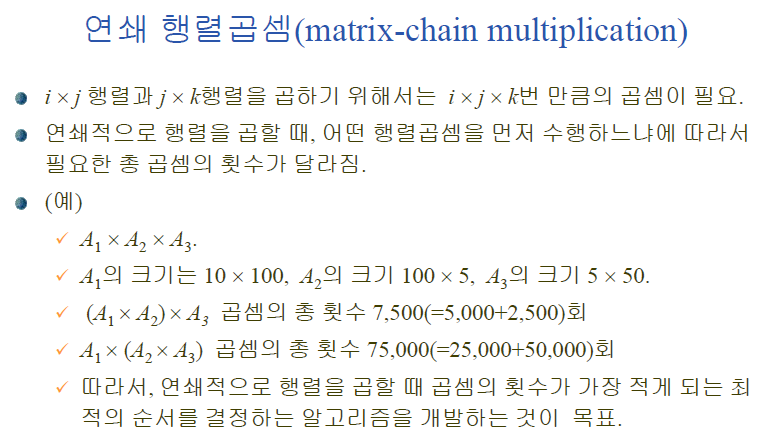 행렬 여러개를 동시에 곱셈할 때, 잘 선택해야 가장 빠르게 연산을 할 수 있습니다. 잘못하면 괜히 곱셈 횟수만 늘어나죠.