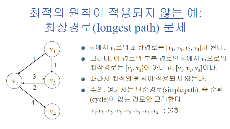 여기서 최적의 원칙이 적용되지 않는 대표적인 예는 최장경로 문제입니다.
