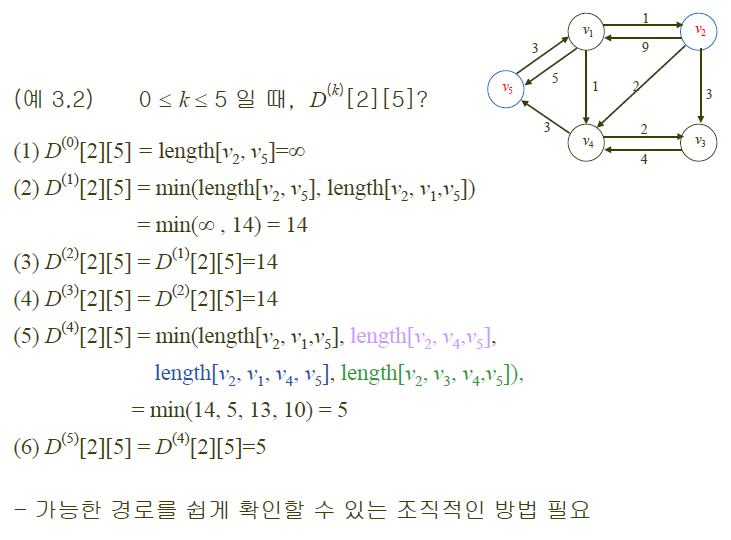 이 알고리즘은 정점 vi에서 다른 정점 vj로의 가능한 모든 경로들의 길이를 구한 뒤 그들 중에서 최소 길이의 경로를 찾는 알고리즘입니다.