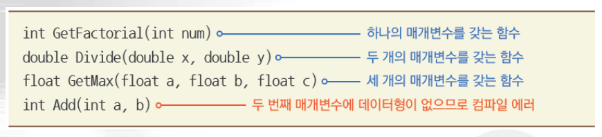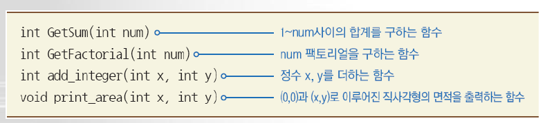 함수를 구성하는 요소를 몇 가지로 나누면 위 예제에 나와있는 것처럼 리턴형, 함수명, 데이터형, 매개변수명, 실행 문장으로 나눌 수 있습니다.