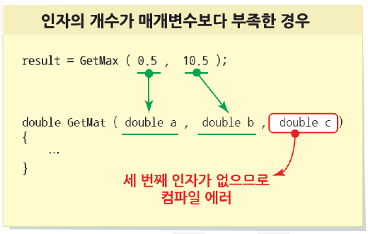 또한 함수를 호출할 때 넘겨주는 인자의 개수는 함수 정의에 있는 매개변수의 개수와 일치해야 합니다.