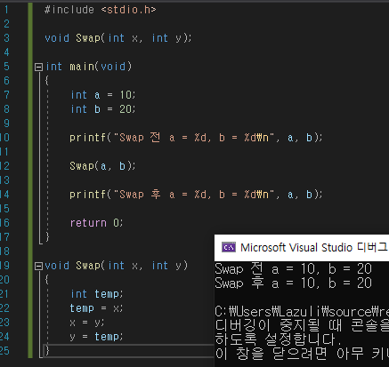 printf("Swap 후 a = %d, b = %d\n", a, b);