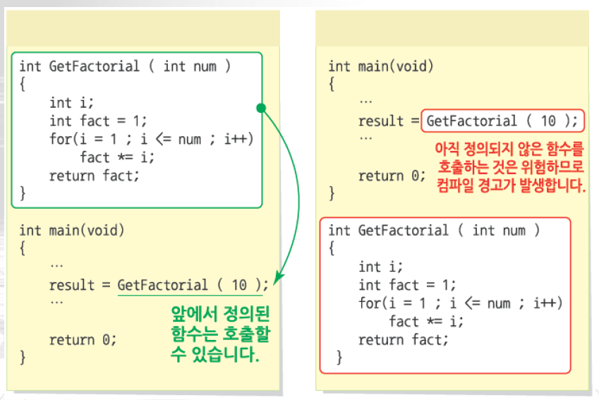 컴퓨터는 C언어를 위에서부터 쭉 내려오면서 읽기 때문에 함수를 사용했는데 함수가 정의가 되어있지 않으면 당연히 정상적으로 작동하지 않습니다. (컴파일러에 따라 실행은 되지만 경고가 나타날 수 있습니다.)