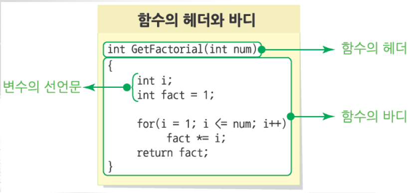 헤더는 리턴형, 이름, 매개변수를 적는 부분이고 바디는 { } 안에 함수가 처리할 문장을 나열한 부분입니다.