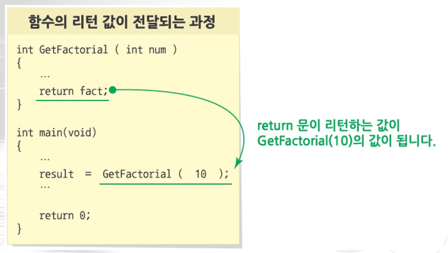 이 부분에서 GetFactorial(10)의 return값인 fact가 3628800이고, 이 return값이 그대로 result1에 할당되고 그 값이 printf를 통해 출력되면서 동작하게 됩니다.