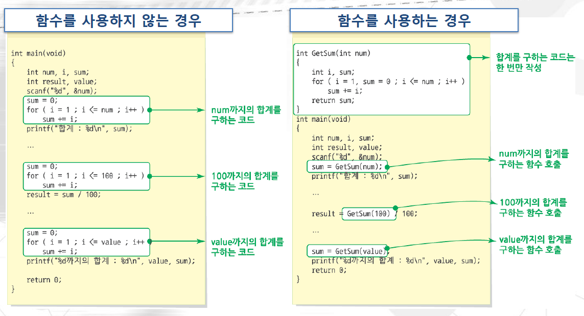 - 기능별로 함수를 작성해서 사용하므로 프로그램의 모듈화가 보다 쉬워집니다.
