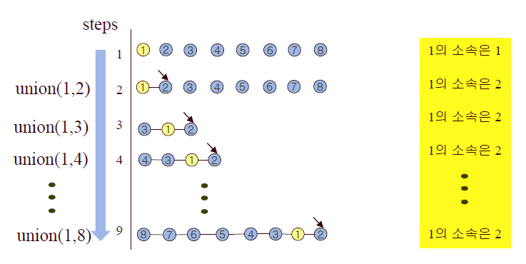 만약 union을 (1,2)부터 ... (1,8)까지 한다면 1의 소속은 단 1번만 바뀌게 됩니다.
