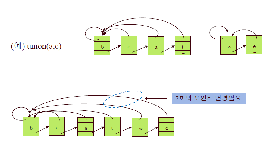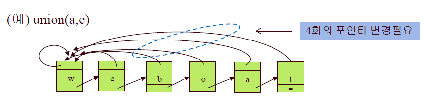 union(u,v)의 경우 u가 속해있는 리스트의 set의 맨 처음(이름)으로 가는 포인터를 v가 속해있는 set의 맨 처음(이름)으로 바꿔줍니다. u->v가 되는 것이죠. (반대도 가능하긴 합니다!)