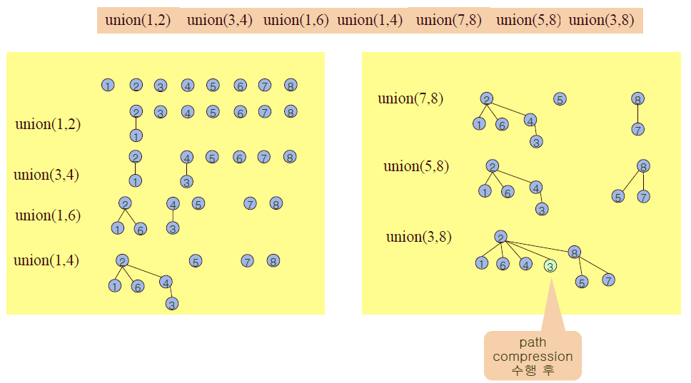 순서대로 union(1,2), union(3,4), union(1,6), union(1,4), union(7,8), union(5,8), union(3,8)을 순서대로 진행한 모습입니다.