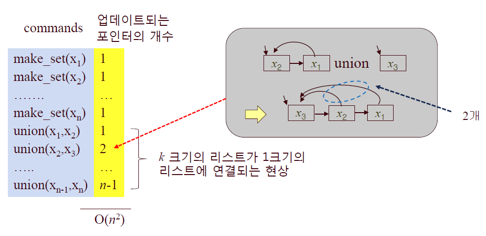 즉 union(x1,x2) ... union(x1,x_n)은 포인터 이동횟수가 1+2+3+...+(n-2)가 되어서, 등차수열의 합을 계산하면 O(n^2)시간이 필요하다는 것을 알 수 있습니다. 이 말은 weighting-union heuristic을 사용한 list/array의 O(n lg n)보다 비효율적이라는 이야기가 됩니다.