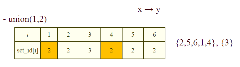 union(x,y)의 경우 set_id[y]를 갖고 있는 원소들의 set_id를 set_id[x]로 변경합니다.