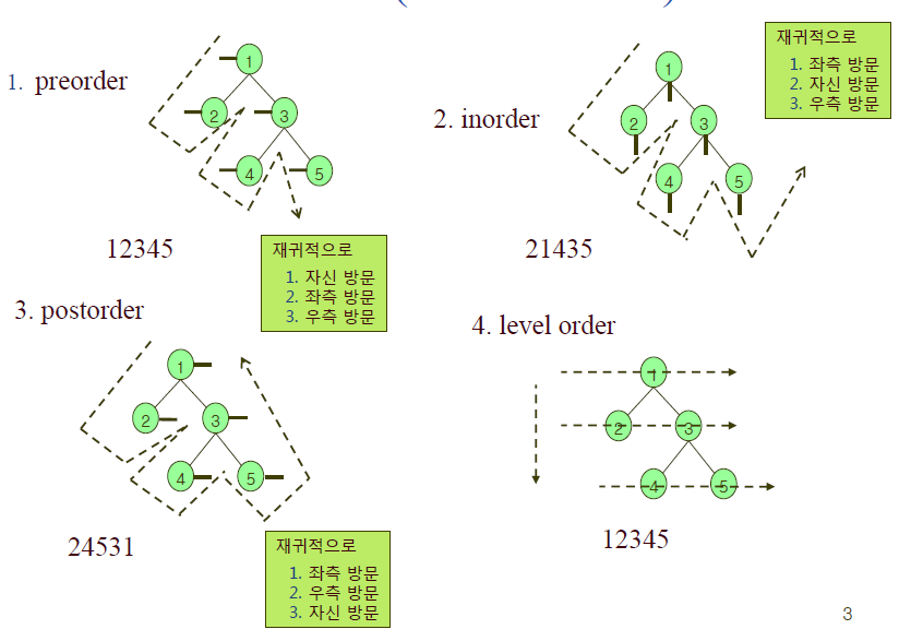 먼저 트리를 방문하는 방식에는 여러 가지가 있는데, 대표적으로 preorder, inorder, postorder, level order가 있습니다.