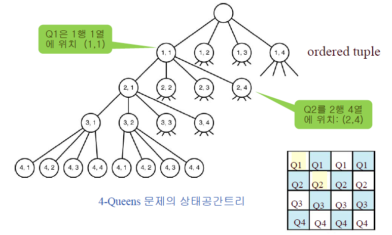 여기서 상태공간트리가 등장하는데, 말이 놓일 수 있는 공간들에 대해서 말이 놓이는 경우의 수를 트리 형태로 보여주는 것이 상태공간트리입니다.