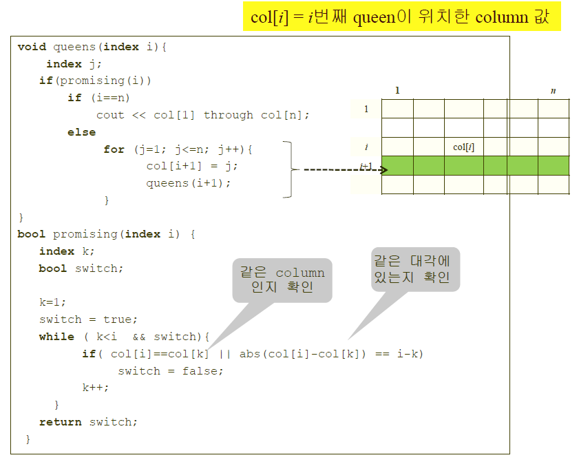 promising은 지금까지 놓은 queen들이랑 현재 위치랑 비교해서 같은 column에 있는지와 같은 대각에 있는지를 확인합니다. 만약 같은 column과 대각에 걸리면 switch를 false로 바꿔줍니다.