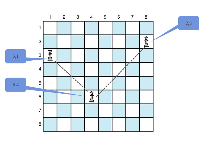 서로 상대방을 위협하지 않으려면 같은 행이나 같은 열, 같은 대각선에 위치하면 안됩니다.