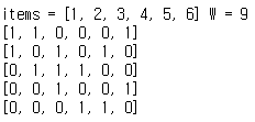 각 인덱스에 위치한 값이 1이면 포함하고 0이면 포함하지 않는 경우입니다!