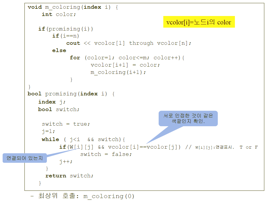 m_coloring 함수는 유망하면 다음 마디에 모든 색을 넣어서 m_coloring(i+1)로 재귀를 돌립니다.