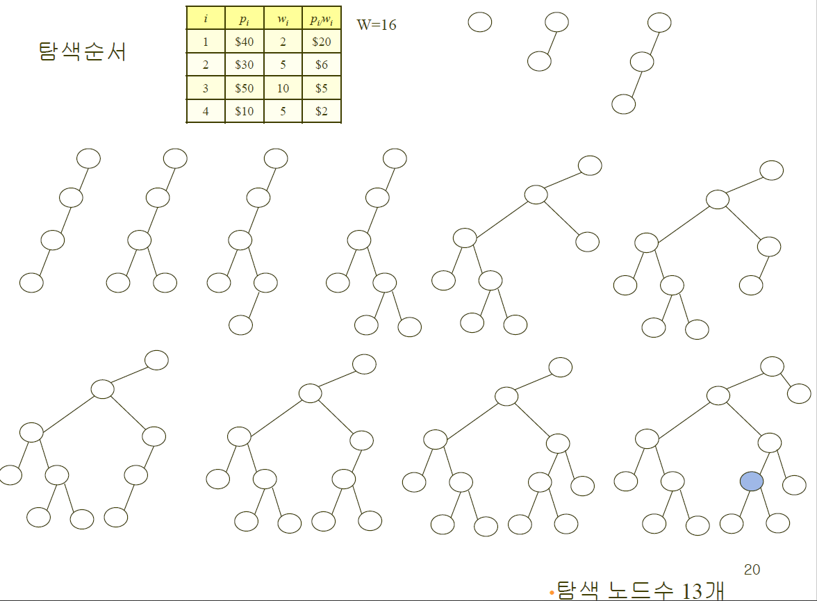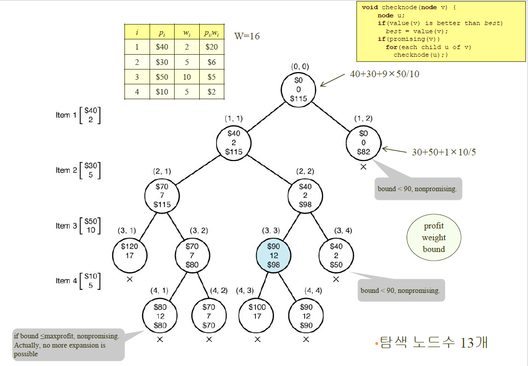 DFS로 그 마디의 profit과 weight를 계산하고, bound(이론적으로 현 상태에서 얻을 수 있는 최대의 이익)를 계산합니다.