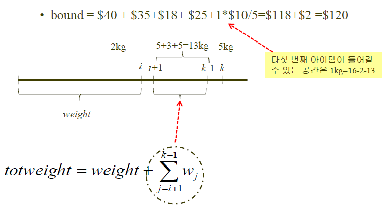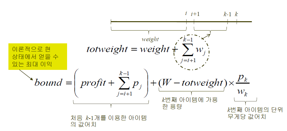 bound를 마디가 수준 i에 있고, 수준 k에 잇는 마디에서 총 무게가 W를 넘는다고 하면 아래와 같다고 가정합니다.
