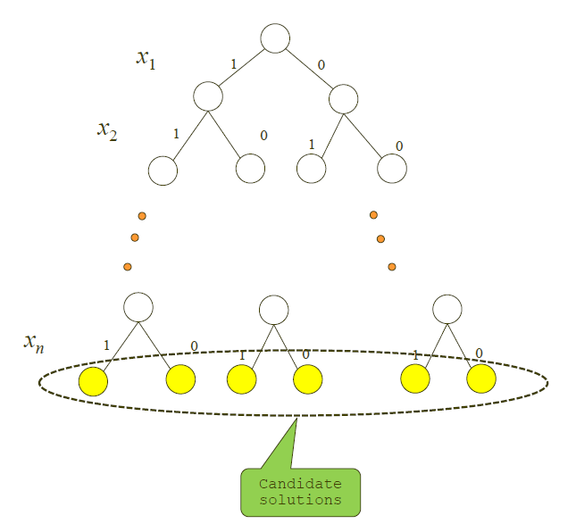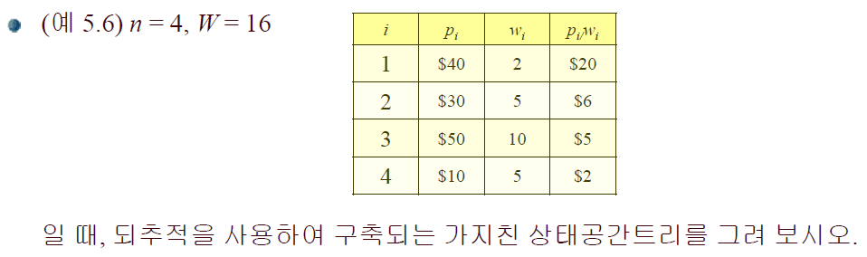 상태공간트리를 만들고 첫 번째 아이템을 배낭에 넣는 경우와 안 넣는 경우를 모두 고려합니다. 이런 식으로 진행하면 뿌리 마디로부터 마지막 마디까지 모든 경로는 해답 후보가 됩니다.