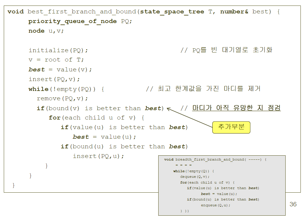 하지만 분기한정법을 이용한 최고우선검색 알고리즘을 사용하더라도 시간복잡도가 지수적이거나 더 오래 걸리기 때문에 "이런 방법을 사용할 수 있다", 혹은 "bound함수는 이렇게 구성할 수 있다"정도로만 파악해도 성공입니다.