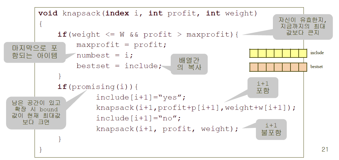 if promising(i, weight, profit): # 다음으로 진행할 수 있으면?