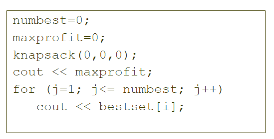 출력을 위해서는 numbest와 maxprofit를 미리 초기화하고, knapsack 함수를 돌립니다.
