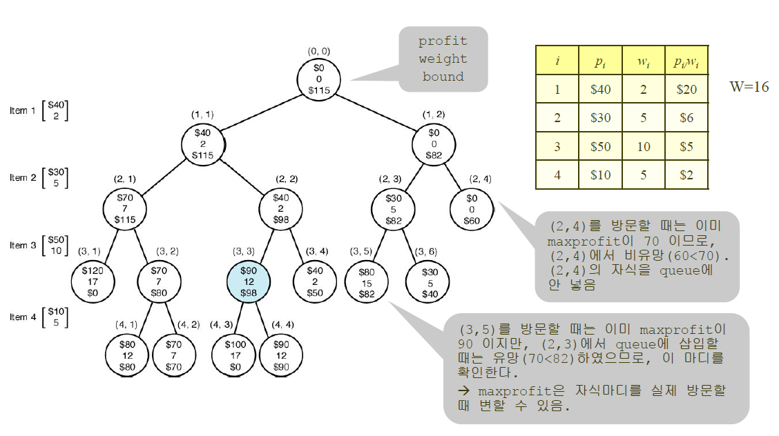 왼쪽으로 내려가면 maxprofit이 90임을 확인하게 되고, 오른쪽으로 내려가면 bound가 90보다 작아지기 때문에 유망하지 않는다는 것을 확인할 수 있습니다.