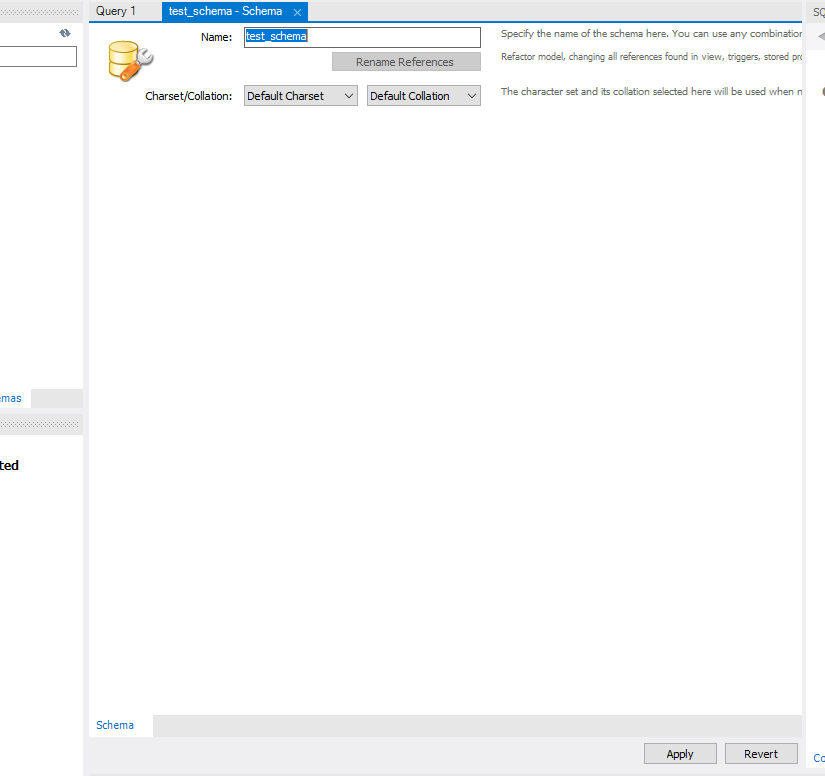 Navigator탭의 Schemas에서 오른쪽 마우스버튼을 눌러서 스키마를 하나 만들어줍니다.